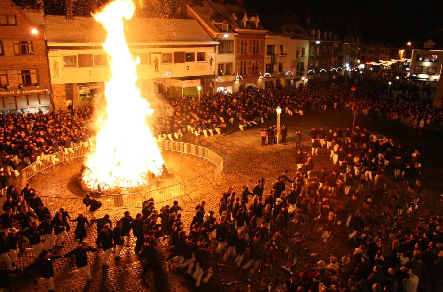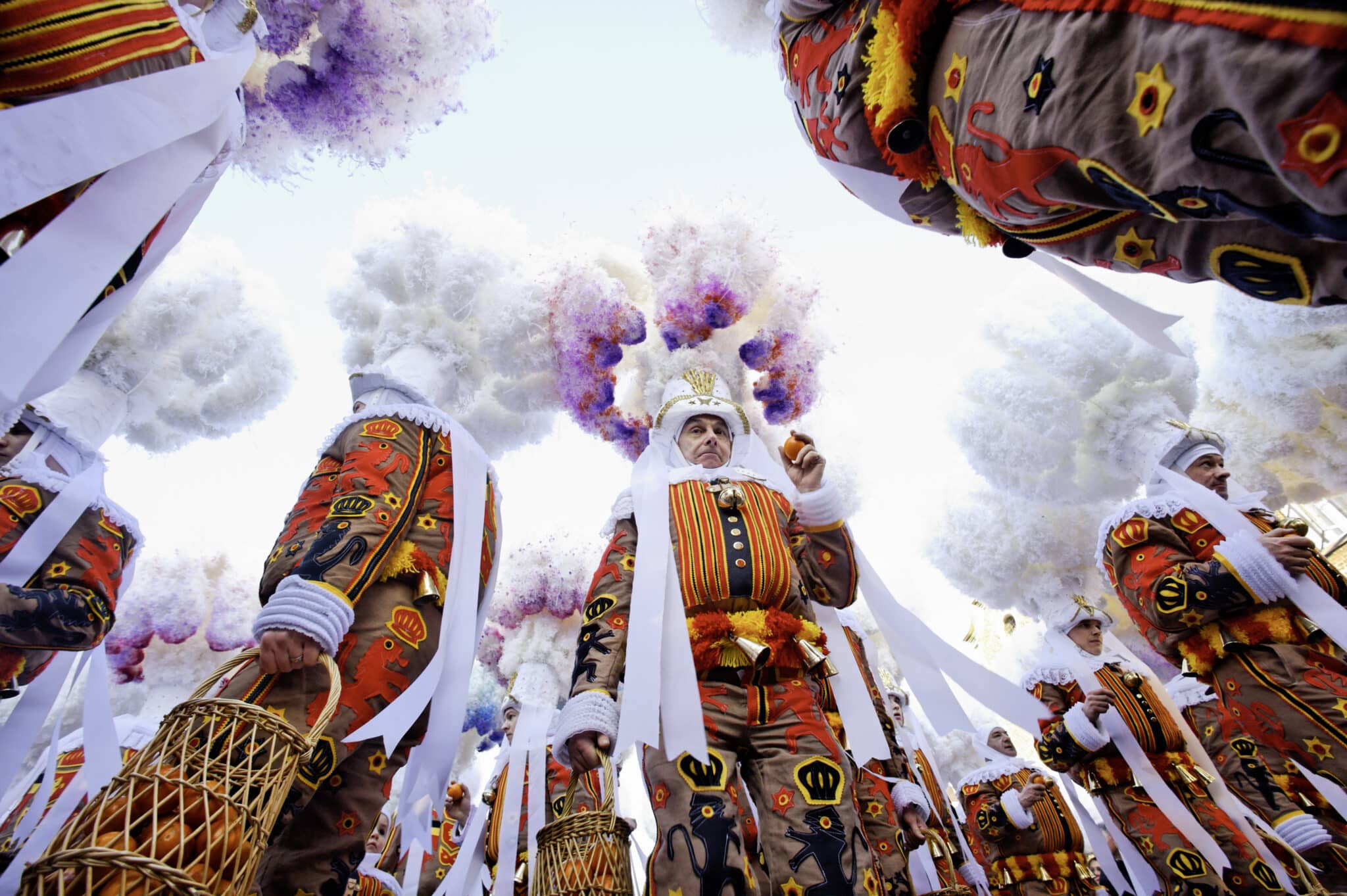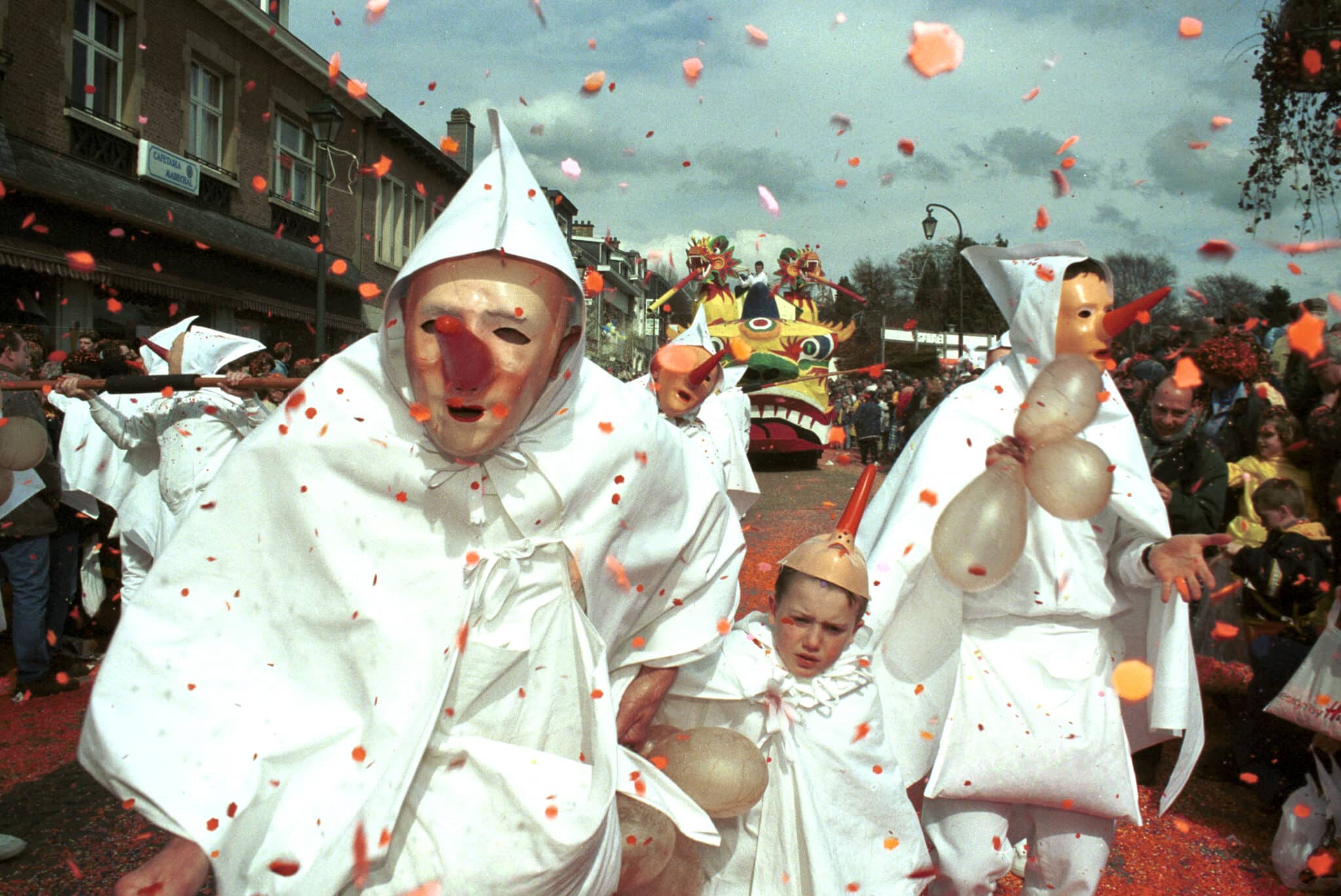 À Stavelot, les vedettes sont les Blancs-Moussis, tout de blanc vêtus avec un long nez rouge et un sourire XXL. Leur mission ? Bombarder la foule de confettis. Leurs armes secrètes ? Des vessies de porc pour flageller les spectateurs (tout doux, promis). Leur rituel ? Accrocher des harengs secs dans les cheveux des plus téméraires et polissons !