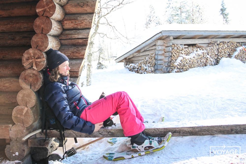 Au bout de 45 minutes, nous arrivons au refuge de Rönölä, une ancienne maison de bucheron rouge posée au bord d’un lac gelé.