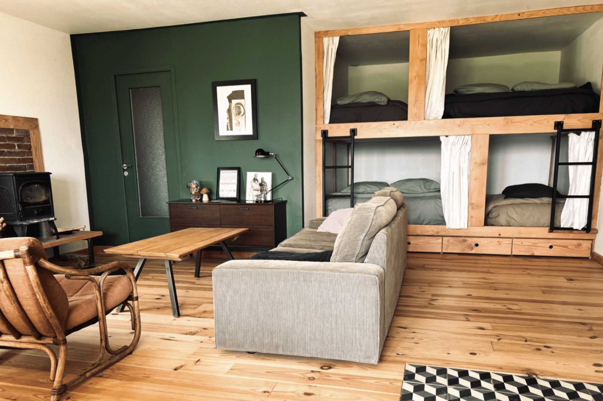 Le résultat ? Un lieu ultra sympa, plein d’énergie, à la fois sportif et rassurant, où tout est pensé pour faciliter la vie des parents. Après l’effort, place au réconfort dans Le Refuge, un gîte cosy installé dans un ancien hangar industriel transformé de leurs mains et avec tout leur cœur avec des matériaux recyclés. Bois de la scierie locale, lits-cabanes façon tanière (le rêve pour les kids !), alcôves et lumières douces et un poêle qui crépite : l’ambiance rappelle un chalet de montagne version Suisse Normande.